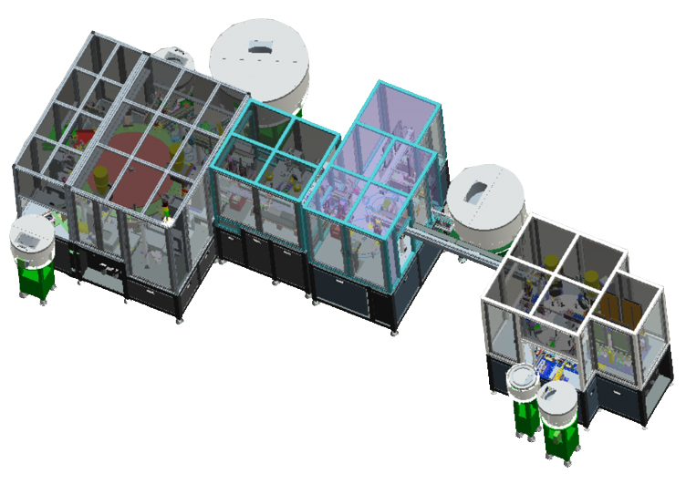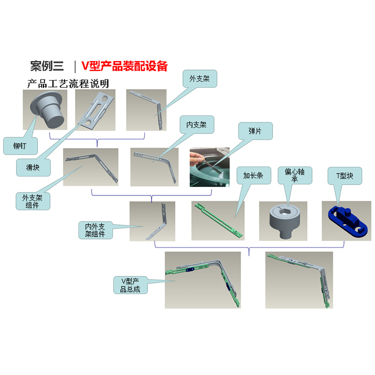 該設備自動完成V型產品的裝配、旋抑、涂油及檢測。產品所有零件采用振動盤或者彈夾自動上料、設備通過有無檢測、高度檢測以及CCD檢測自動區分良品和不良品。合格產品自動輸送到成品盤。